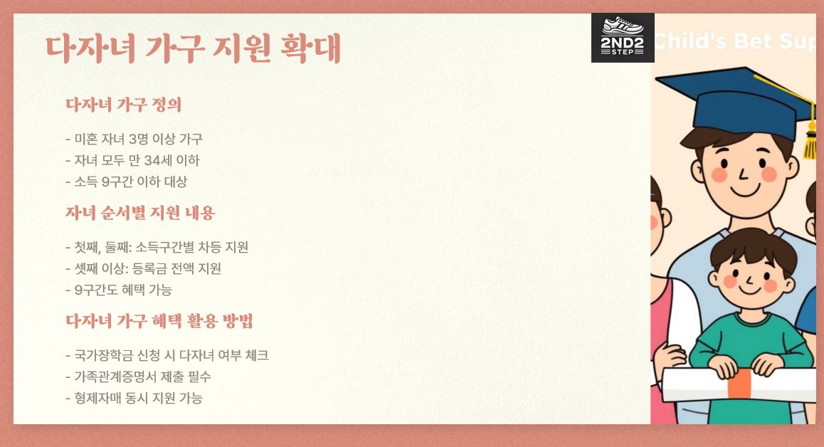 2025년부터 다자녀 가구(미혼 자녀 3명 이상)를 위한 국가장학금 지원이 강화되었습니다.